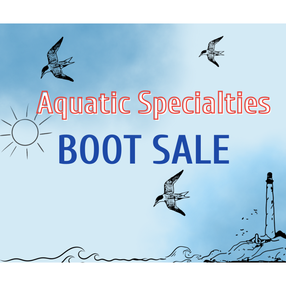 Select boots & water shoes are $35/pair or lower marked price while supplies lasts. Various styles and sizes available but supply is limited. Please contact Aquatic Specialties about availability.