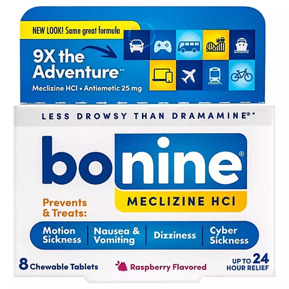 Take Bonine Tablets one hour before travel for 24 hours of motion sickness relief. This fruity raspberry tablet is just what your travel medicine kit is missing. Find nausea relief in an easy chewable form, with less drowsiness than Original Dramamine.