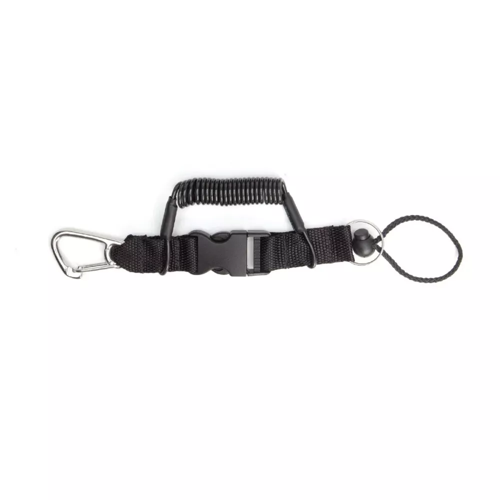 One end has a stainless steel carabiner clip. The other end has a stainless steel split ring and cord with lock