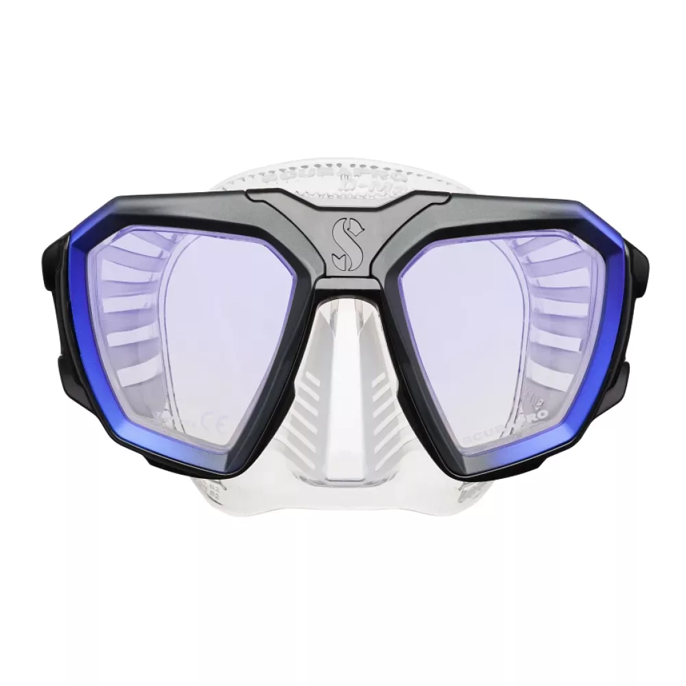 Sharing the design scheme of the new D-Series D420 regulator, the new D-Mask is a sleek, premium mask well-suited for all types of diving. The D-Mask benefits from SCUBAPRO's second-generation Trufit technology. This design approach features a mask skirt with thicker, firmer silicone near the mask frame to provide support and rigidity, and thinner silicone contouring the face for comfort and to ensure a watertight seal. The mask features true color UV protective lenses that deliver the best balance of surface protection and underwater clarity. It also features an interchangeable lens system for optional optical lenses. Offering a comfortable fit and a wide field of view, the D-Mask is available in black with blue accents to match the D420 regulator’s color scheme. It comes with a choice of black or clear skirts in two sizes: Medium and Small, and there’s also a Wide skirt available in black only.