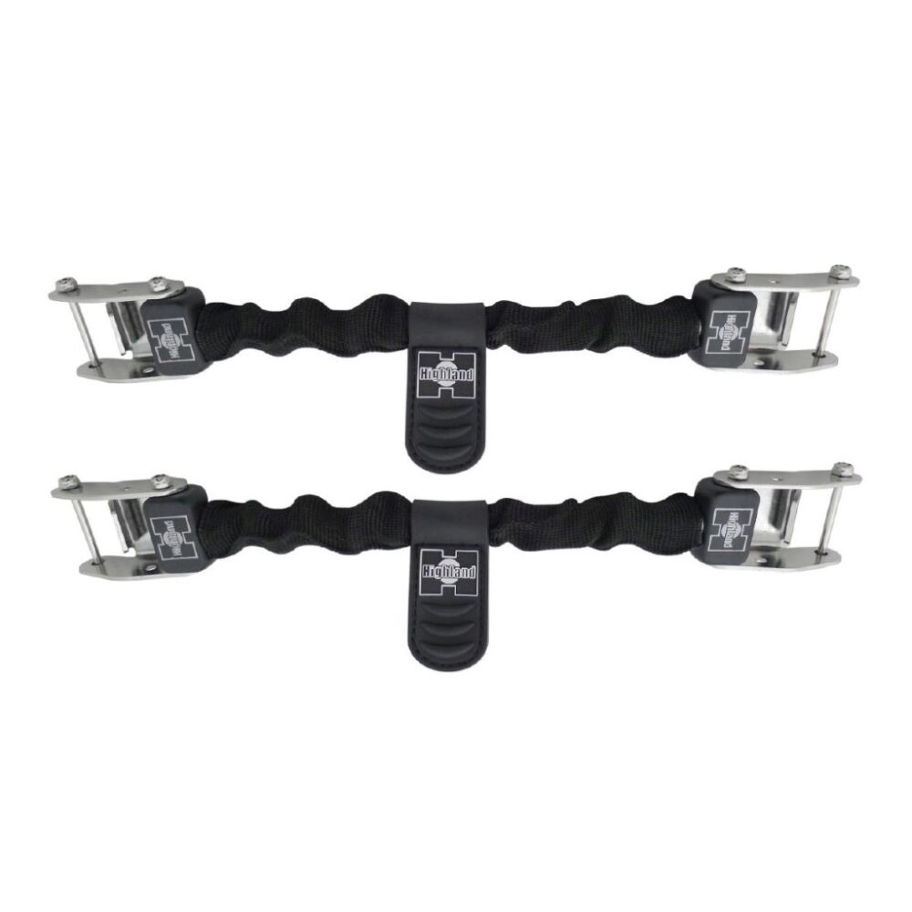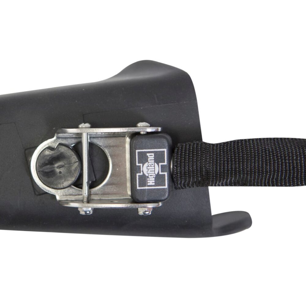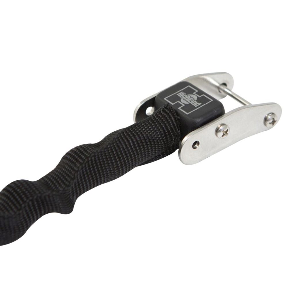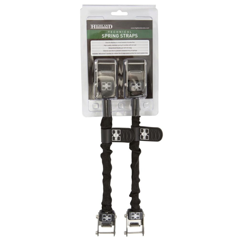 Spring heel fin straps are popular because they are comfortable, easy to use and practically indestructible. Highland premium spring fin straps are made from stainless steel springs and covered with nylon tube webbing to protect the spring and keep out grass and other plant matter. The thumb puller is streamlined and designed not to snag on objects like traditional finger loop designs can do. The springs have machined Delrin ends that attach to one of two types of stainless steel adapter fittings with a stainless screw and nylon lock nut. Nylon line on the inside of the spring prevents over-extension of the strap.