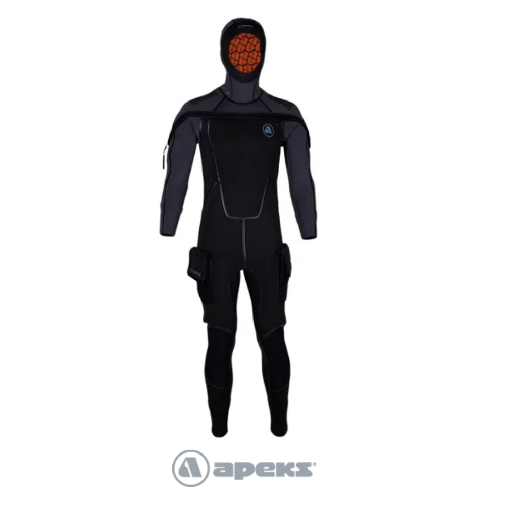 - Apeks 8/7mm semi-dry wetsuit crafted with super-stretch neoprene for ultimate flexibility.