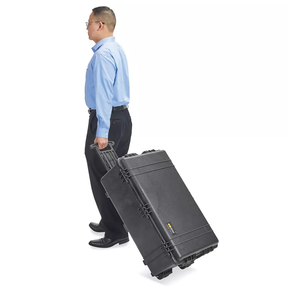 The Pelican™ 1650 Transport Case is an unbreakable, watertight, airtight, dustproof, chemical-resistant and corrosion-proof hard case that protects any and all equipment from the elements. The case has an automatic purge valve for quick pressure equalization after changes in atmospheric pressure as well as two side haul handles, front haul handle, an extension handle and wheels with stainless steel bearings.